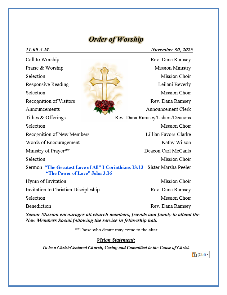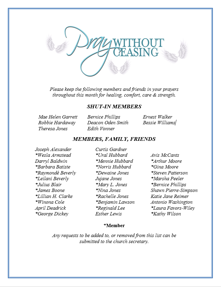 | Saturday 10:00 am Brotherhood (3rd Saturday) 10:00 am Deaconess Ministry (Last Saturday before 1st Sunday) 11:00 am Women’s Fellowship (Before 2nd & 4th Sunday) 1:00 pm Youth Ushers Ministry (Saturday before 2nd Sunday) |