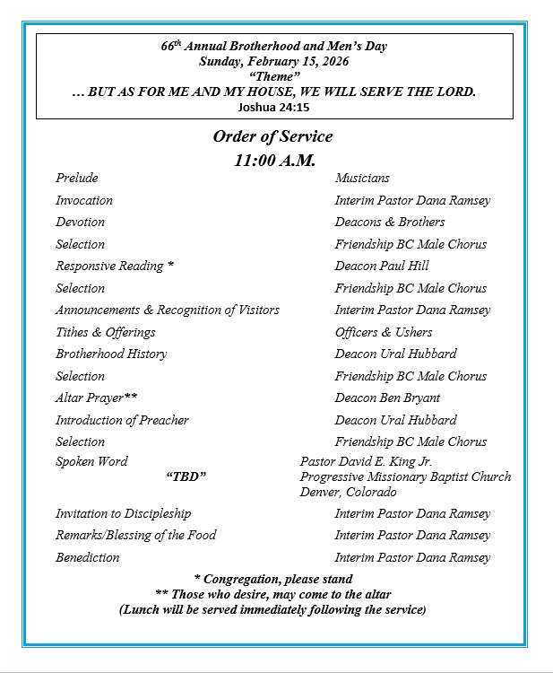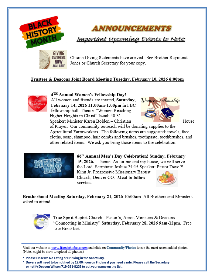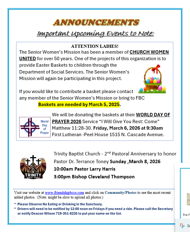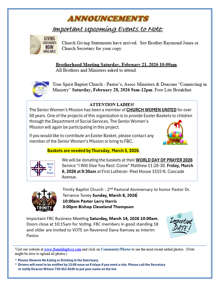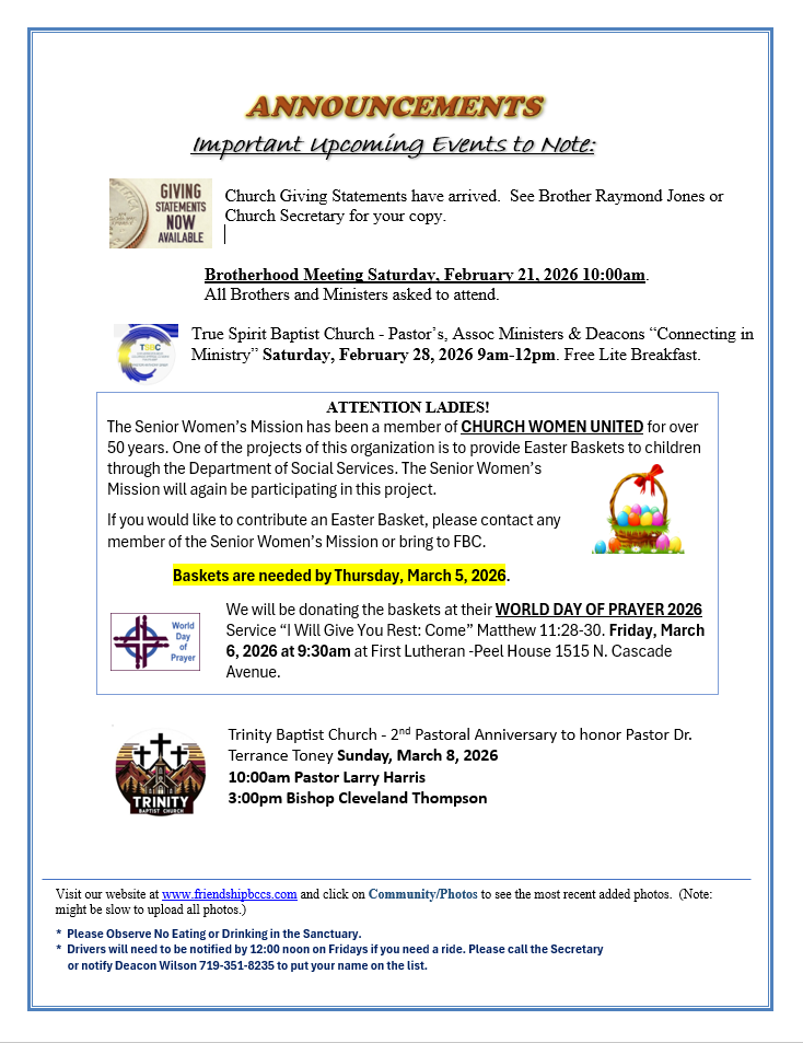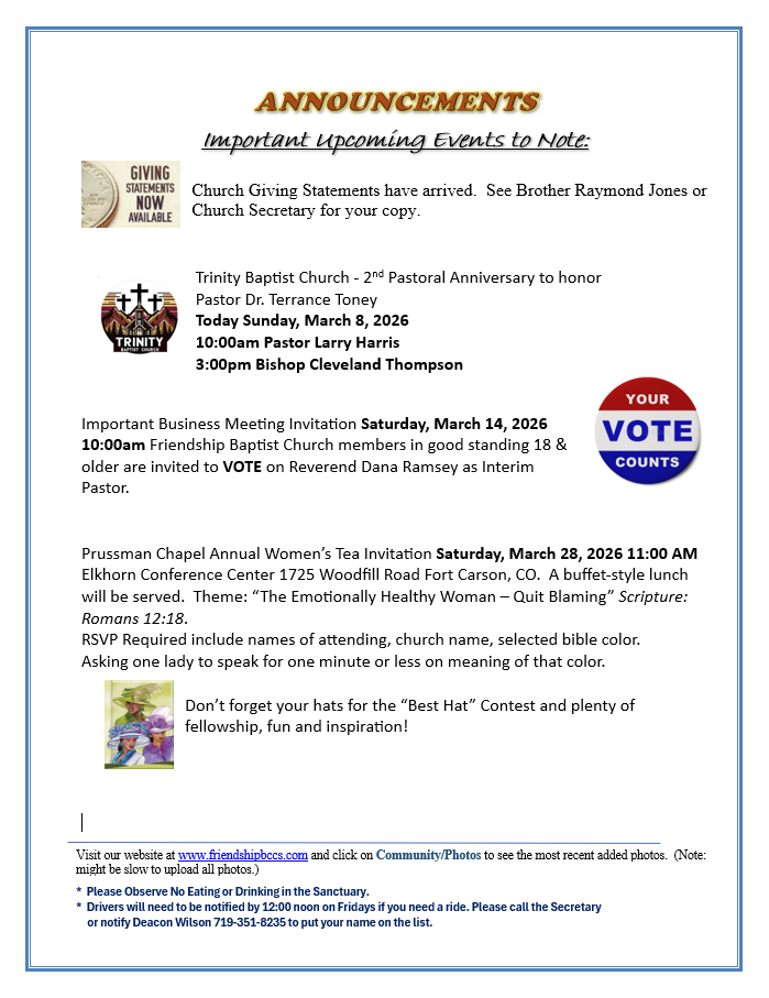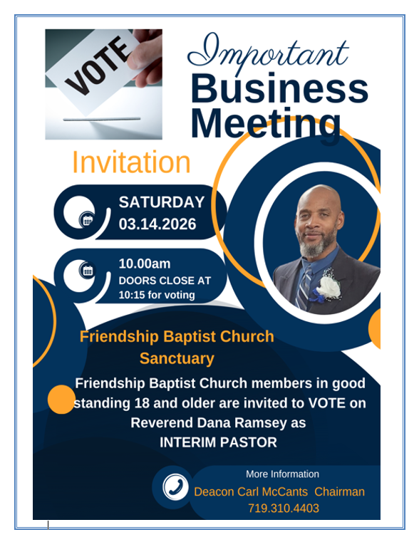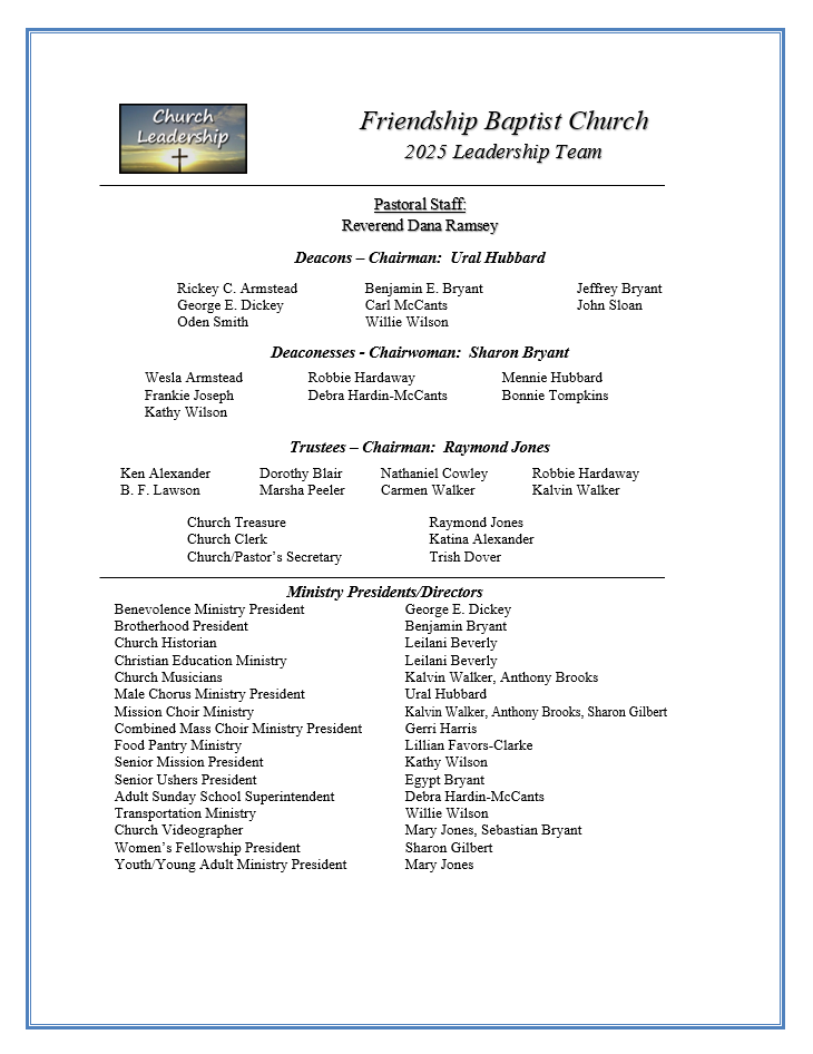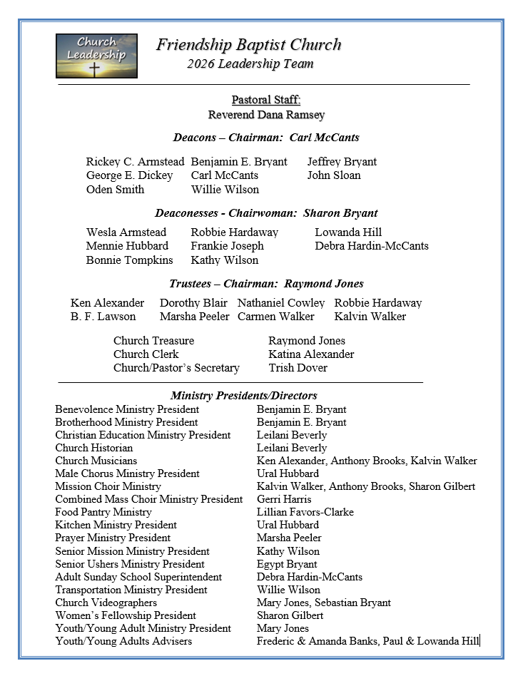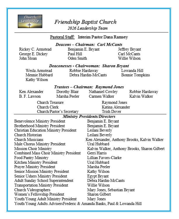 PASTOR OPENING – Click on Link for Job Description https://friendshipbccs.com/wp-content/uploads/2025/09/Pastor-Job-Description-091725-2.pdf for Pastor Application https://friendshipbccs.com/wp-content/uploads/2025/03/Pastor-FMBC-Application-B.pdf or click on Documents/Forms above.