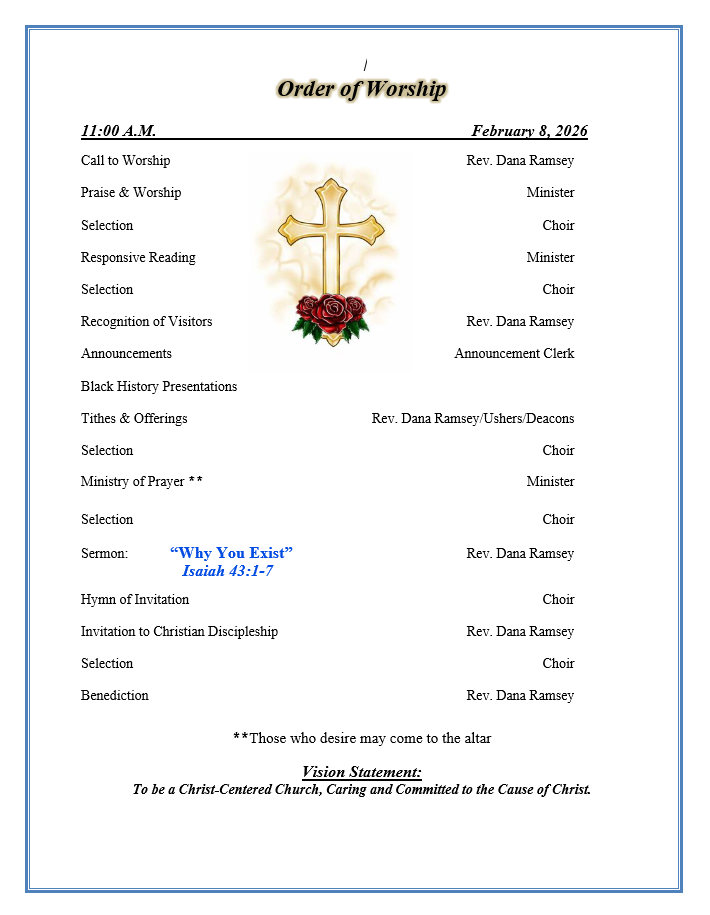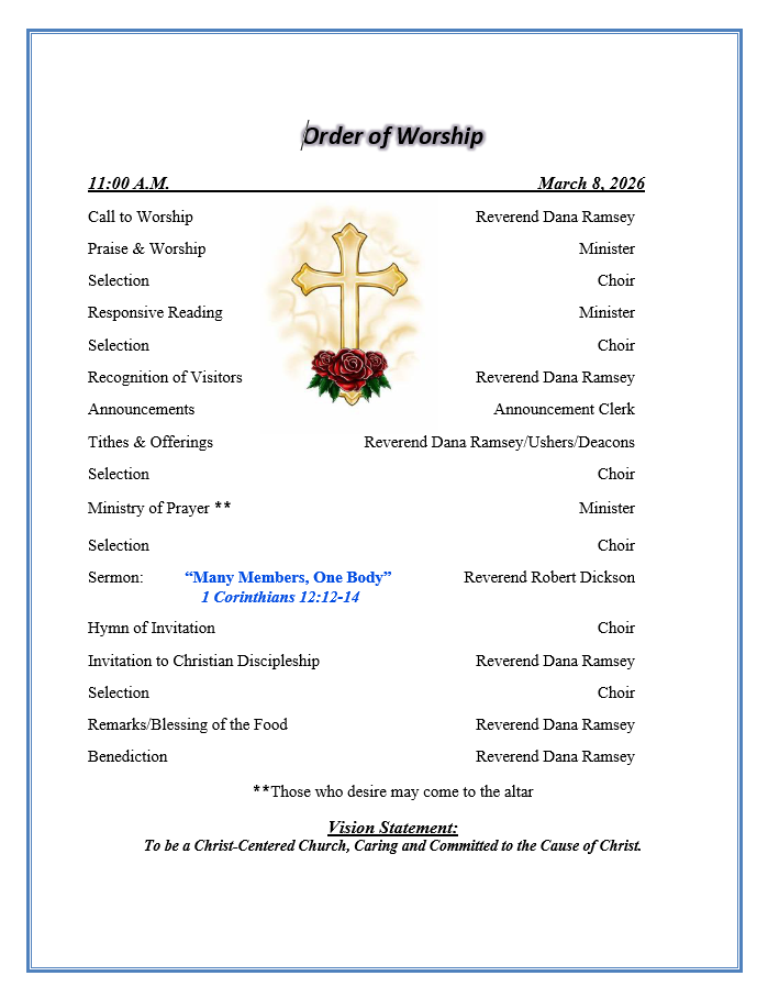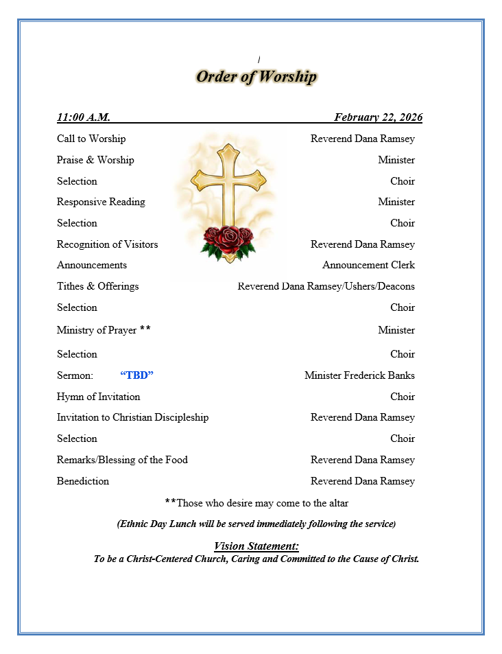 | Tuesday 5:00 pm Trustees Meeting (3rd Tuesday) 6:00 pm Senior Ushers Ministry (Before 1st Sunday) 6:00 pm Deacons Meeting (Tuesday after 2nd Sunday of every month) |