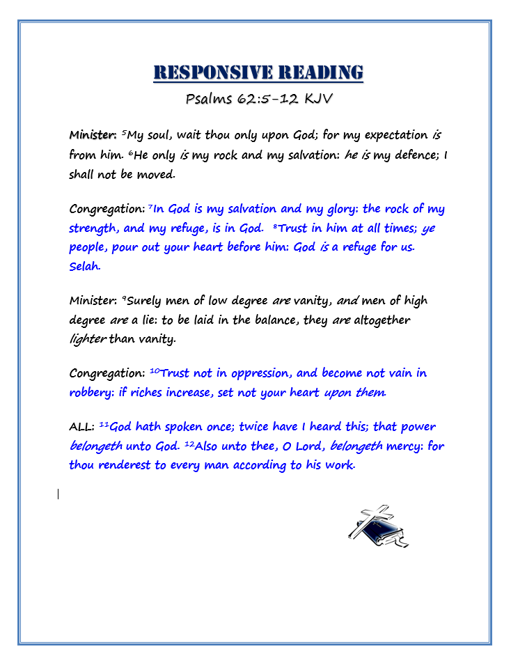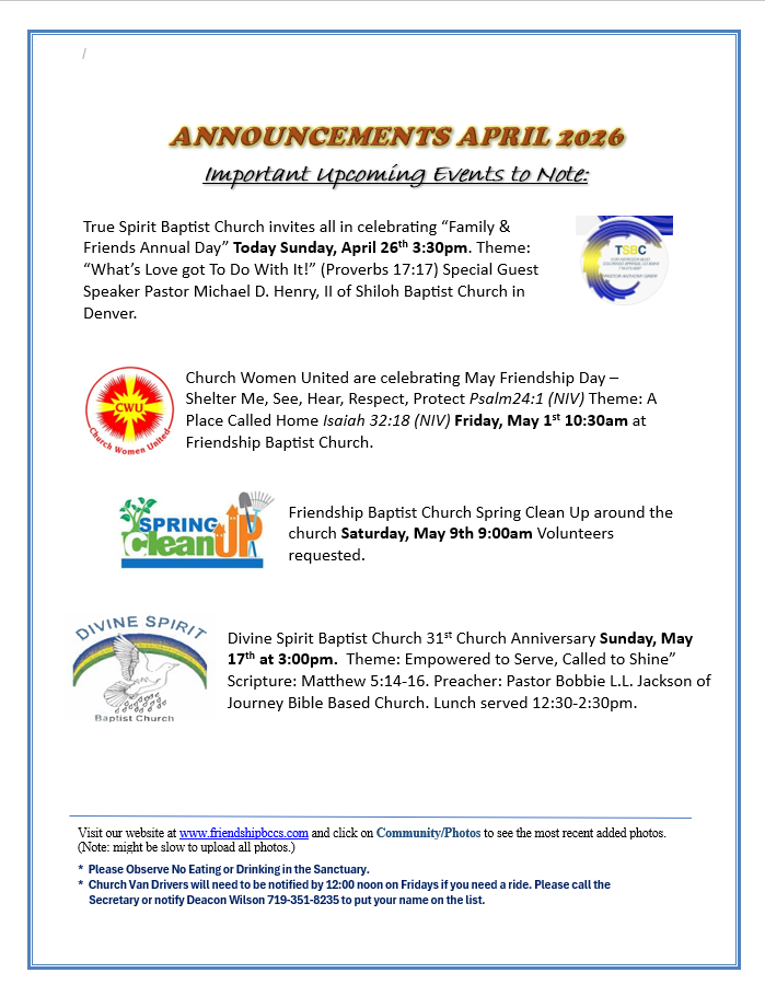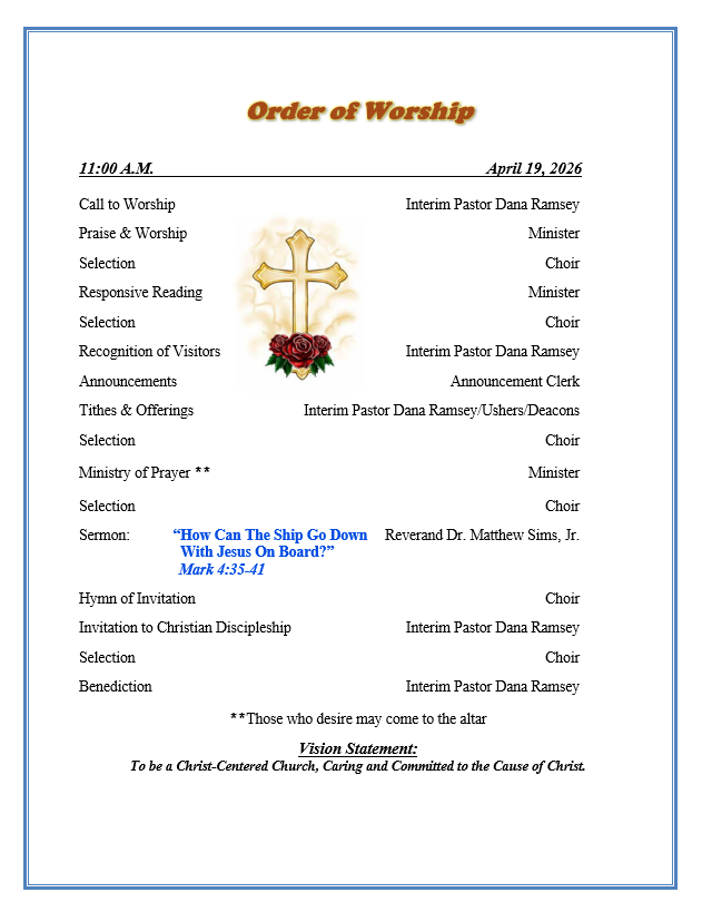 | Saturday 10:00 am Brotherhood Ministry (3rd Saturday) 10:00 am Deaconess Ministry (Last Saturday before 1st Sunday) 11:00 am Women’s Fellowship (Before 2nd & 4th Sunday) 1:00 pm Youth Ushers Ministry (Saturday before 2nd Sunday) |