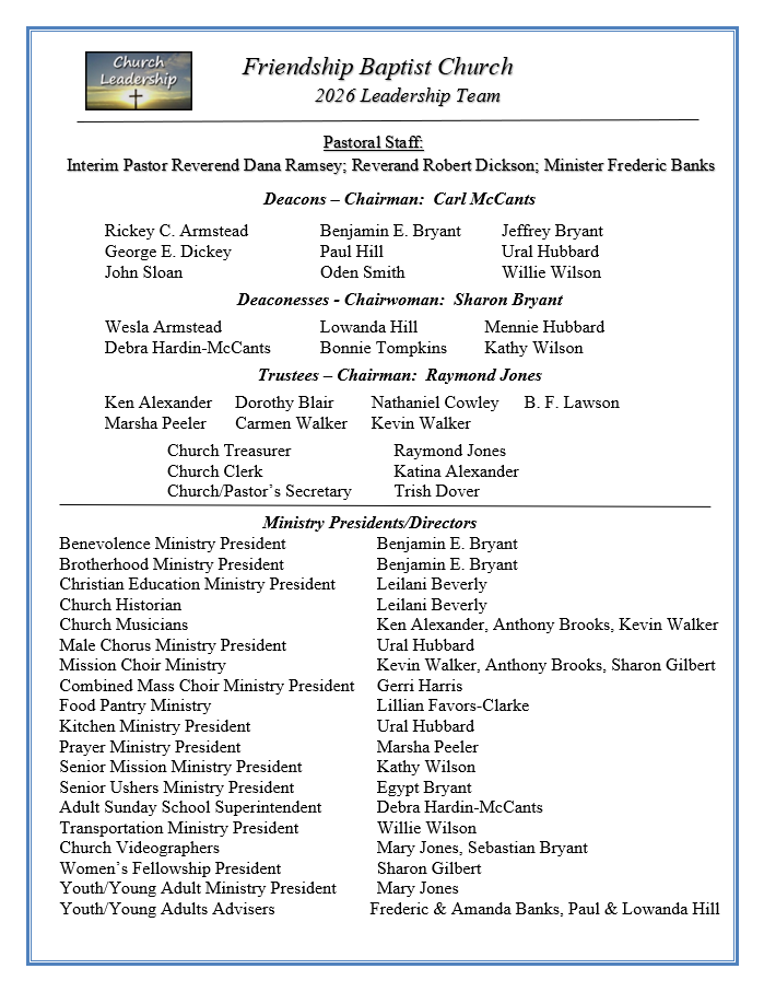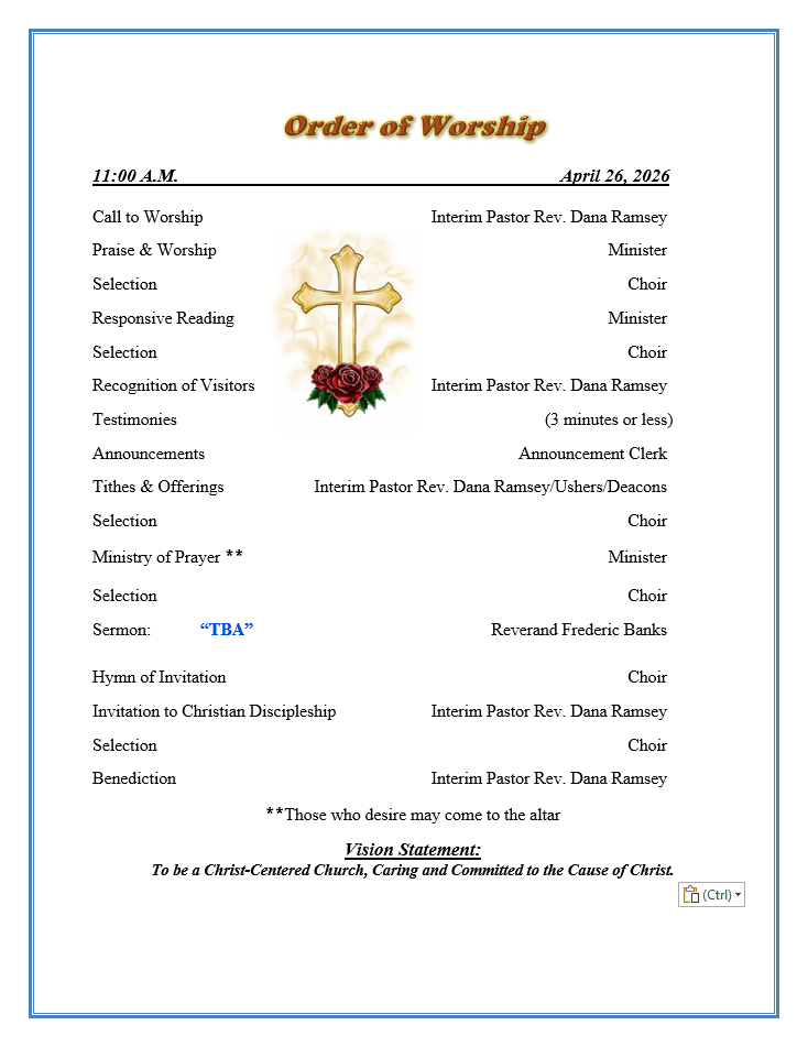 | Tuesday 5:00 pm Trustees Meeting (3rd Tuesday) 6:00 pm Senior Ushers Ministry (Before 1st Sunday) 6:00 pm Deacons Meeting (Tuesday after 2nd Sunday of every month) 1:00 pm Prayer Ministry Meeting (4th Tuesday) |